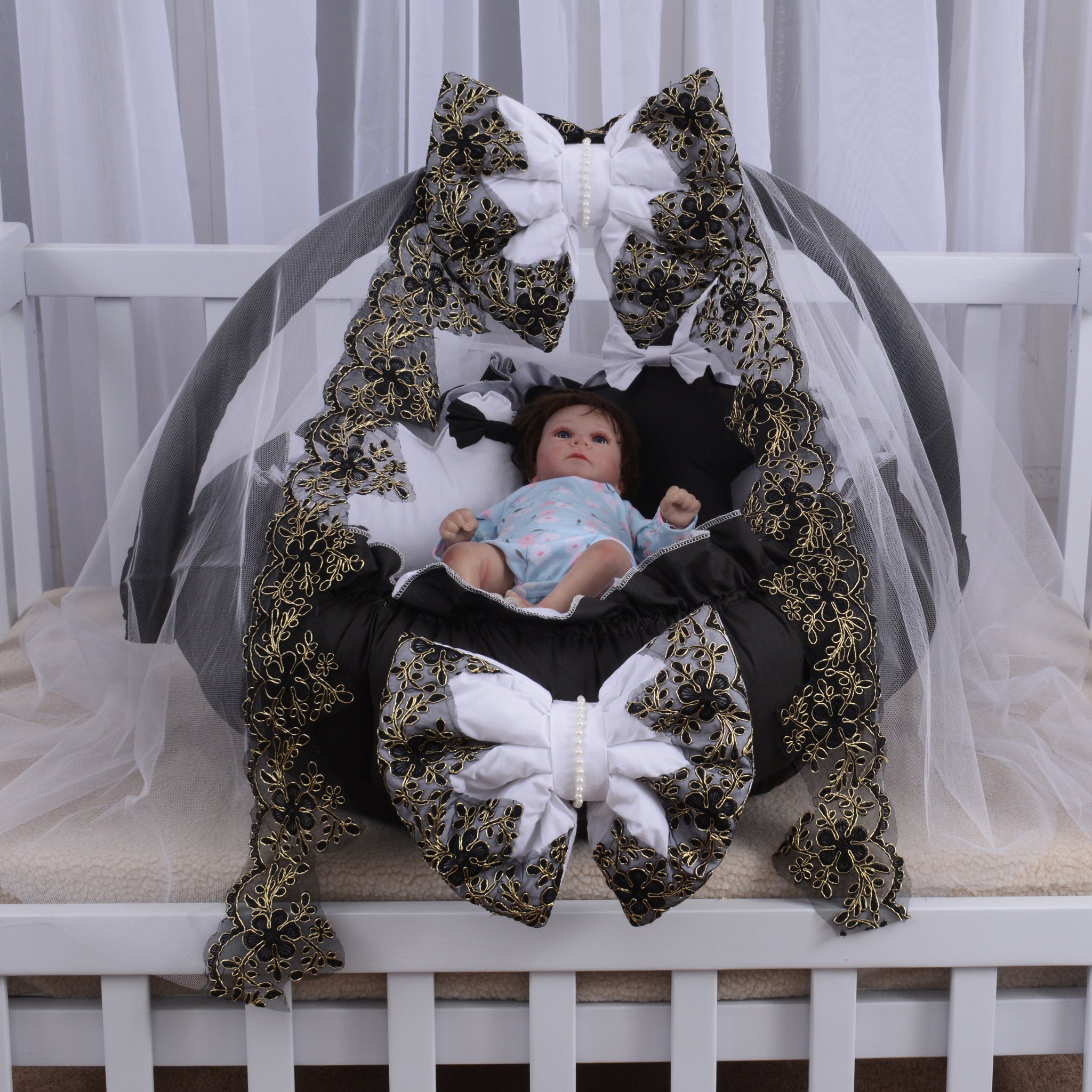 Luxury Baby Round Cot with Pillows and Net- Black & White